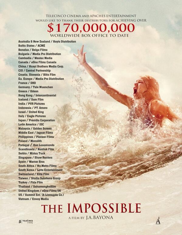 Ох не выдержала, конечно сходила. Фильм очень сильный, эмоции просто переполняют...просто все внутри сжалось когда их накрыло волной и отпустило только на первом этаже когда мне подарили шарик в честь праздника... пришла в себя... Байона молодец просто взял и показал историю обычной семьи, но как... это невероятно..смотришь и все это пропускаешь через себя... столько мыслей возникает о жизни.... правда в особо тяжкие моменты успокаивала мысль, о том что я знаю об этом фильме и что видела видео о съемках и что все остались живы...Замечательно сыграли Наоми и мальчик сигравший Лукаса, Юэн просто супер, так эмоционально сыграл, жаль что его так мало в фильме... Музыка порясающая, в конце фильма так не хотелось выходить из зала, а просто сидеть и слушать....